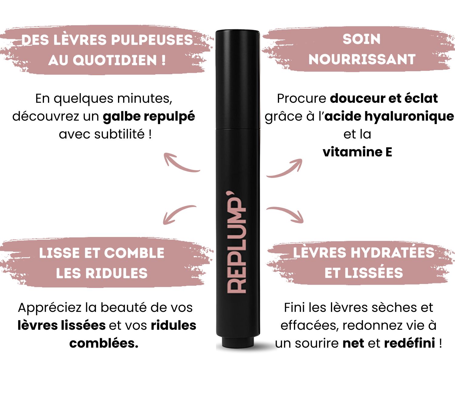 J’ai testé plein de soins et je finissais toujours avec les lèvres sèches… Avec Replump’™, c’est totalement différent : une réelle hydratation qui dure, un volume subtil et naturel, sensation agréable effet mentholé . Je l’utilise juste avec mon crayon à lèvres et j’adore le rendu.